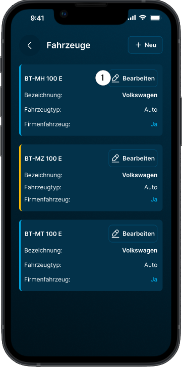 Um ein Fahrzeug zu bearbeiten, tippen sie auf "Bearbeiten"❶