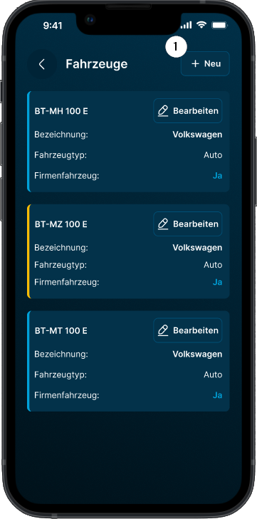 Um ein neues Fahrzeug hinzuzufügen, tippen Sie auf „Neu“ ❶.