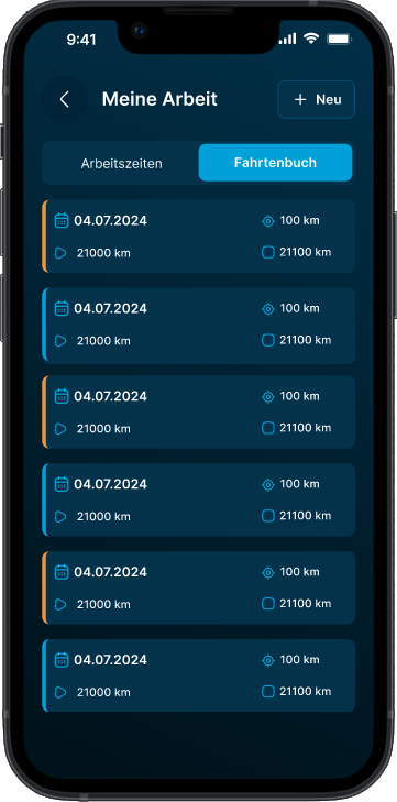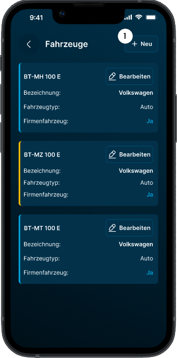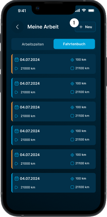 Tippen Sie im Fahrtenbuch auf den blauen Button „+ Neu“ ❶.