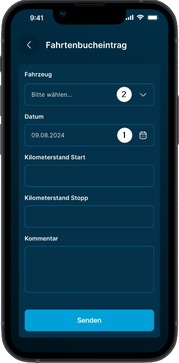 Im folgenden Dialog wählen Sie das Datum ❶, das Fahrzeug ❷ und geben Start- und Endkilometerstände ein.