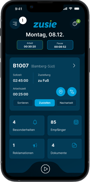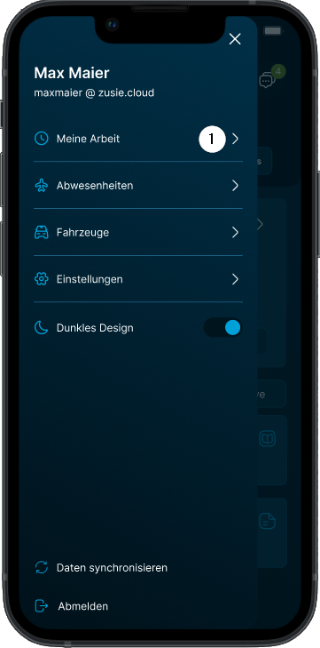 Sie befinden sich im Homescreen. Tippen Sie auf das Menü-Symbol ❶ und wählen „Meine Arbeit“ ❷.