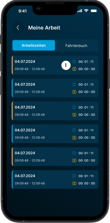 In „Meine Arbeit“ tippen Sie auf den Button „Fahrtenbuch“ ❶.