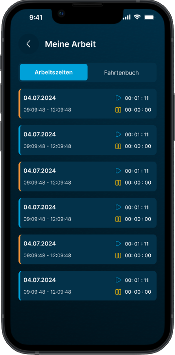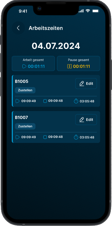 Im Bereich „Meine Arbeit“ sind vergangene Touren einsehbar, inklusive Start-/Stopzeiten und Pausen. Beinhaltet "Zustellgänge" (Touren) und "Fahrtenbuch" (Fahrzeuge, Strecken).