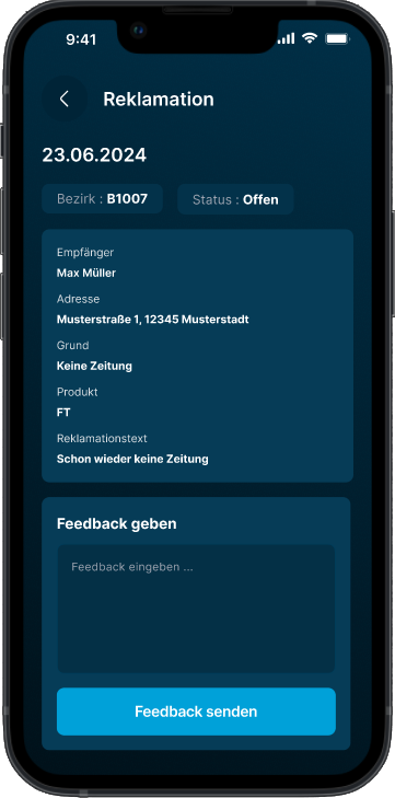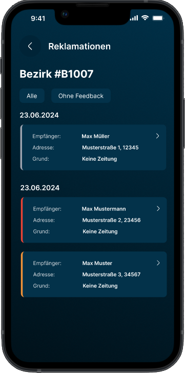 Zeigt eingegangene Reklamationen pro Bezirk an – inkl. Filter- und Suchmöglichkeiten.